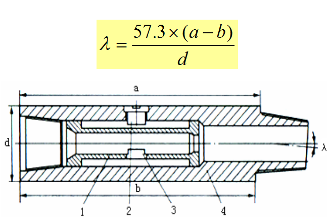 Components: Housing 4, centralizing sleeve 1, directional key 3, set screw 2. Compared with the directional straight sub, it has a structural bend angle λ, and the calculation formula is:λ = 57.3 × (a – b) / d