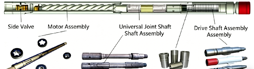 The PDM primarily consists of a top sub, bypass valve, stator, rotor, coupling, water passage sub, bearing assembly, drive shaft, and bottom sub.