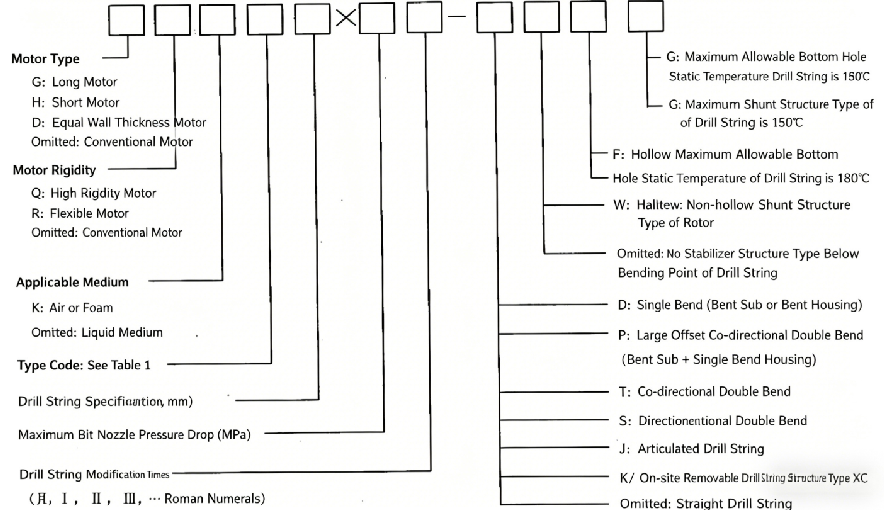 - 5LZ165×7.0Ⅱ : Outside diameter 165 mm, 5/6 lobe ratio hydraulic motor, bit nozzle pressure drop 7.0 MPa, second design modification of straight-body PDM.